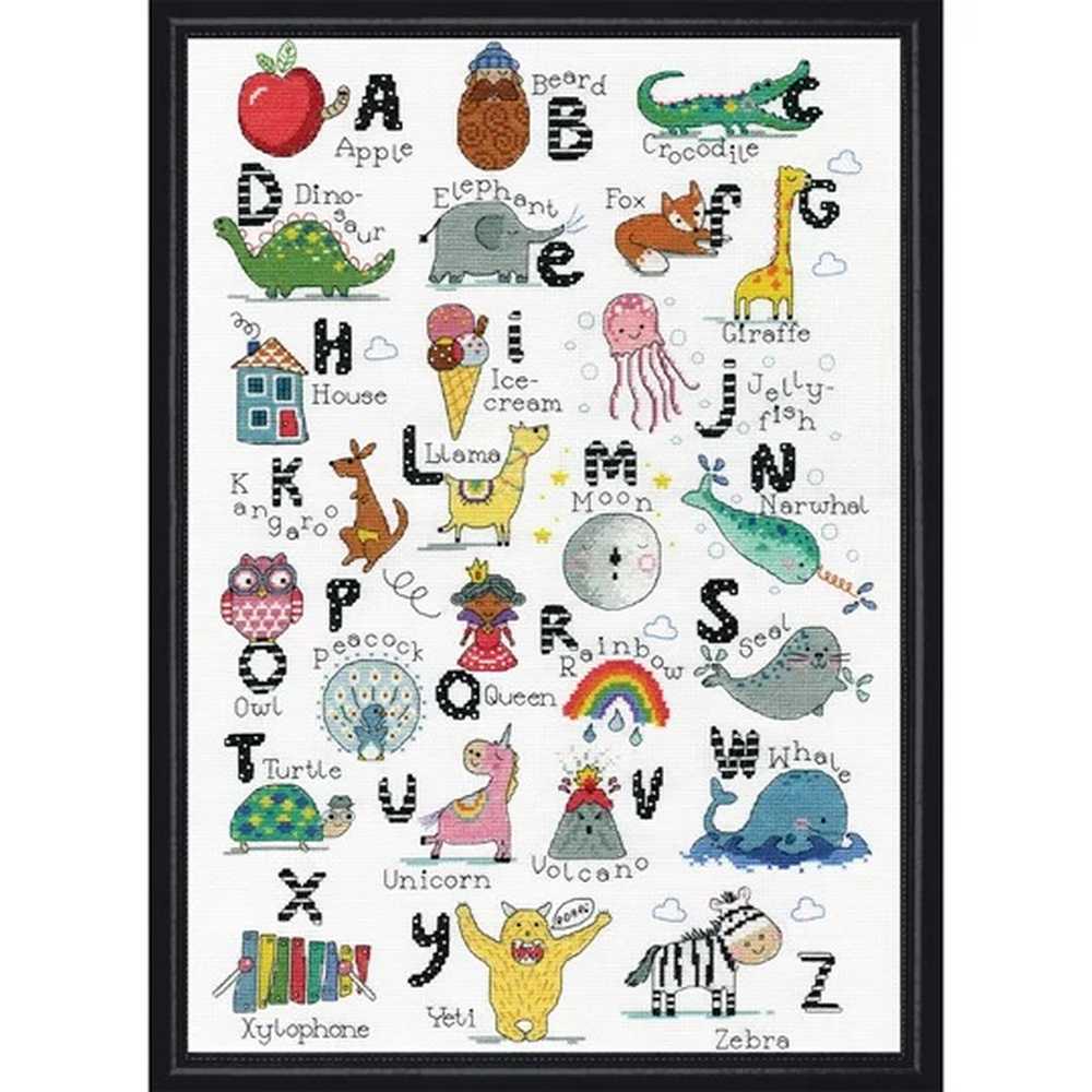 This counted cross stitch from Design Works Crafts, features an illustrated alphabet with fun pictures for each letter. The kit contains 14 count white aida fabric, stranded cottons, needle, chart and instructions.