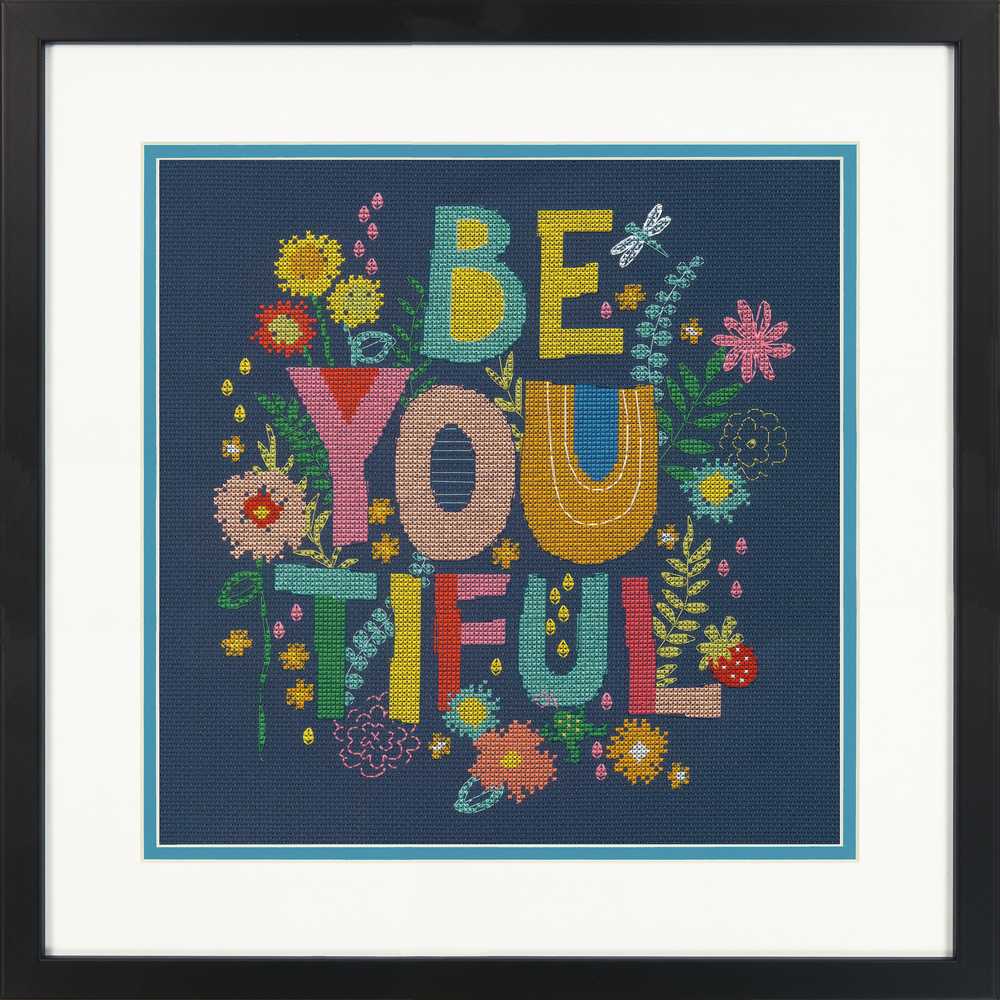 Counted cross stitch kit: Kit includes: pre-sorted, stranded cotton thread; 14 count, navy, cotton, aida fabric; needle; large-square charted design; front sheet picture and instructions. Approximate finished size: (w/h) 28 x 28cm. Design © Crystal Manning.