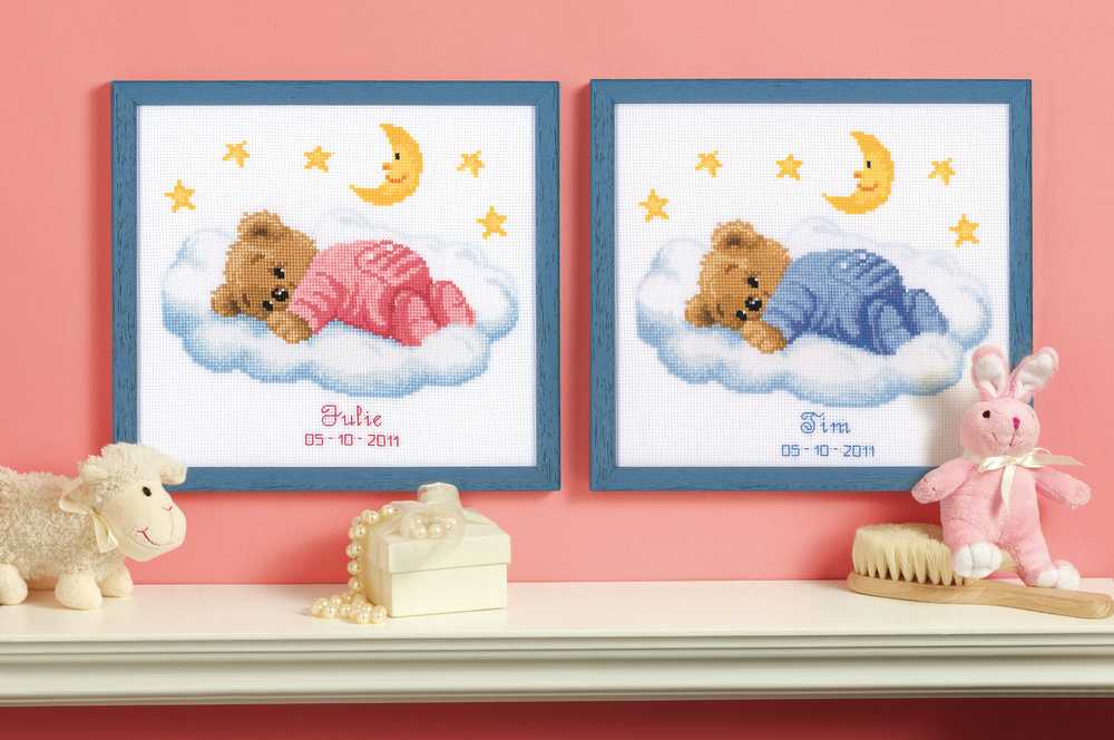 Worked on white 14 count aida and stitched with pre-sorted cotton threads in blue or pink themes. Size: 22 x 20cm or 8.8 x 8in.