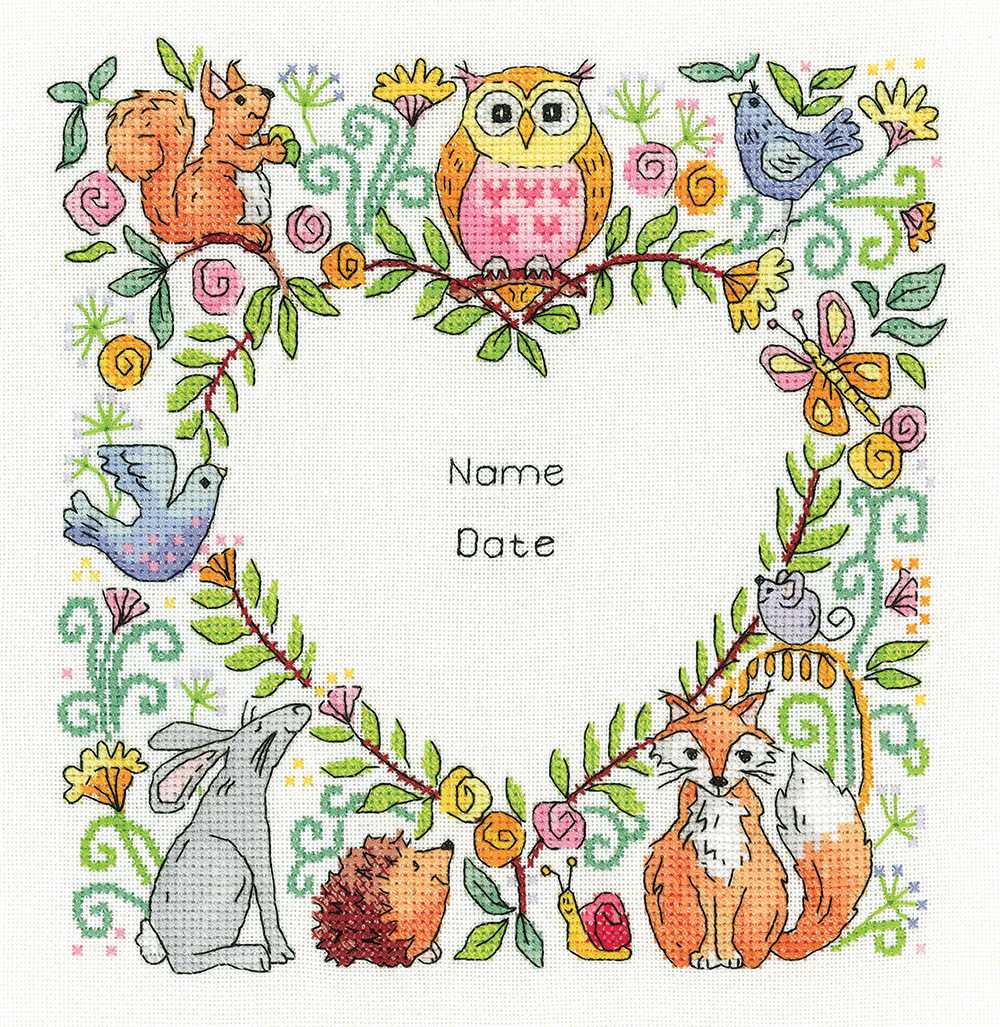 A heart adorned with favourite woodland creastures. Complete with alphabet for you to personalise for an anniversary, wedding or other special occasion!Kit contains chart and instructions, needle, 14 count Aida fabric and presorted DMC stranded cotton threads on a loaded thread organiser and alphabet for personalisation. A design by Karen Carter. Design size approximately 19.5 x 20cm