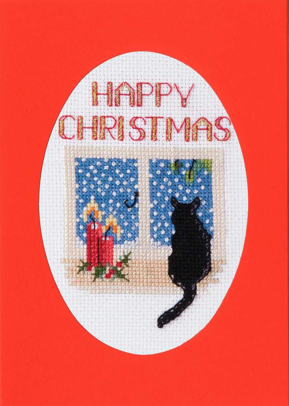 Christmas Card - Christmas Cat Cross Stitch Kit by Derwentwater This kit contains: 16 count antique white aida, stranded cottons in a bundle, metallic threads, needle, stitch diagram, instructions, tri-fold blank card and an envelope. This kit uses full cross stitch and back stitch. The finished size is 9 x 13.3cm