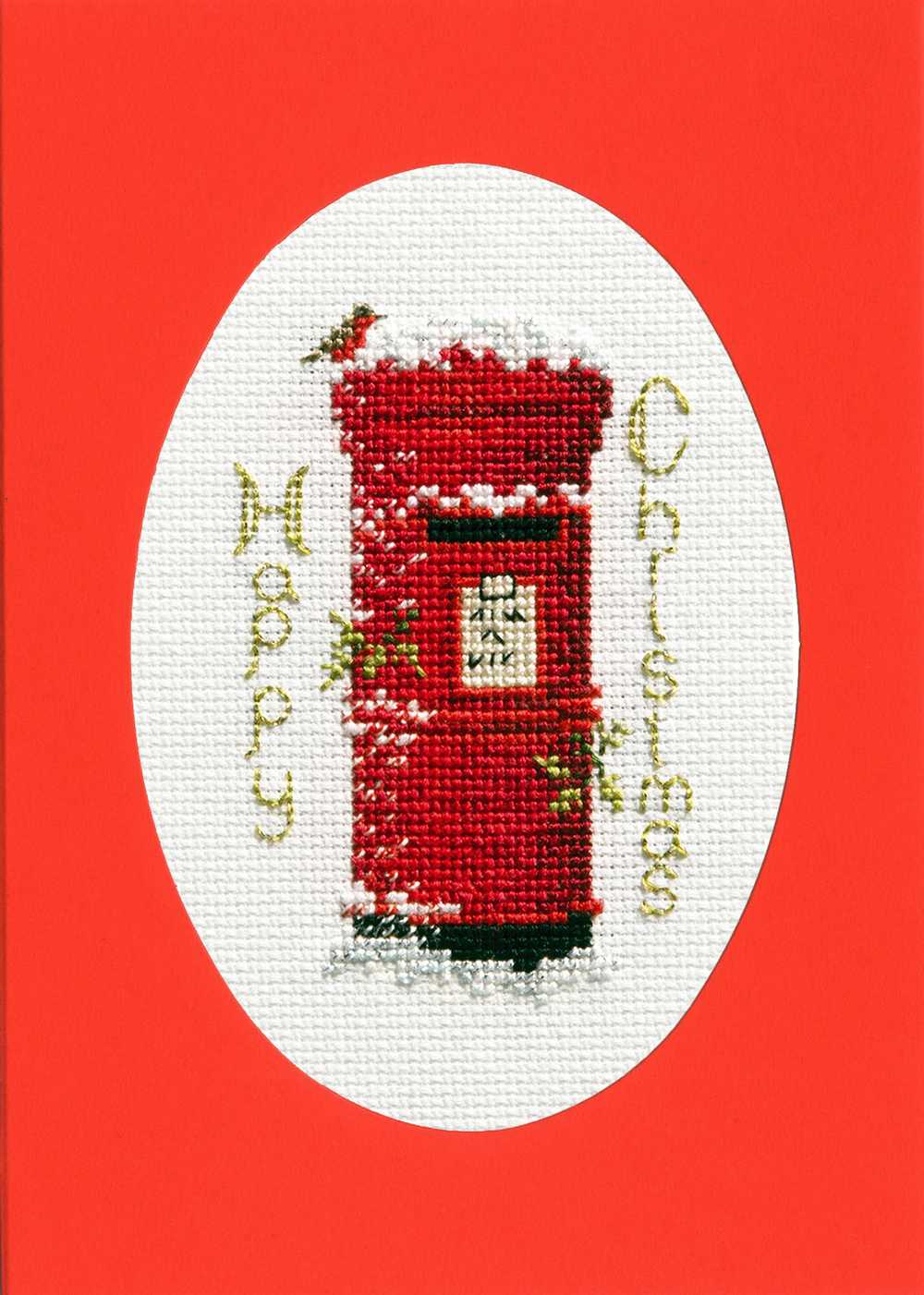 Christmas Card - Christmas Post Cross Stitch Kit by Derwentwate This kit contains: 16 count antique white aida, stranded cottons in a bundle, metallic thread,needle, stitch diagram, instructions, tri-fold blank card and an envelope. This kit uses full cross stitch and back stitch. The finished size is 9 x 13.3cm