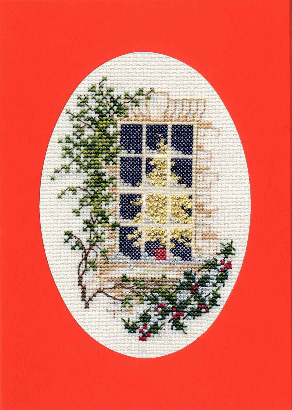 Christmas Card - Christmas Window Cross Stitch Kit by Derwentwater This kit contains: 16 count antique white aida, stranded cottons in a bundle, metallic threads, beads, needle, stitch diagram, instructions, tri-fold blank card and an envelope. This kit uses full cross stitch and back stitch. The finished size is 9 x 13.3cm