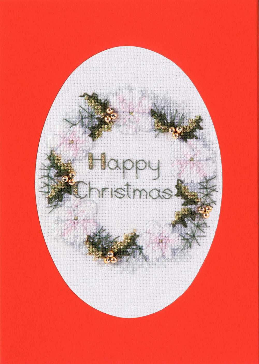 Christmas Card - Golden Wreath Cross Stitch Kit by Derwentwater This kit contains: 16 count antique white aida, stranded cottons in a bundle, metallic threads, beads, needle, stitch diagram, instructions, tri-fold blank card and an envelope. This kit uses full cross stitch and back stitch. The finished size is 9 x 13.3cm