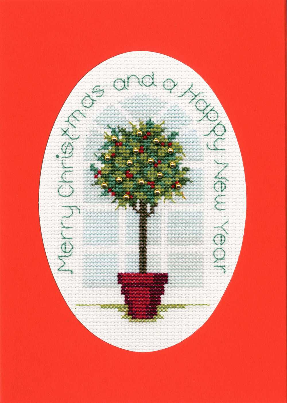 Christmas Card - Holly Tree Cross Stitch Kit by Derwentwater This kit contains: 16 count antique white aida, stranded cottons in a bundle, beads, needle, stitch diagram, instructions, tri-fold blank card and an envelope. This kit uses full cross stitch and back stitch. The finished size is 9 x 13.3cm