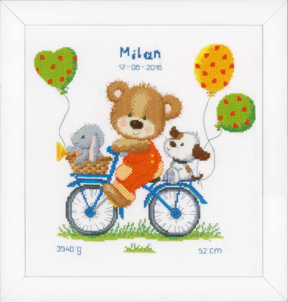 Cycling Bear Birth Sampler Cross Stitch Kit Vervaco