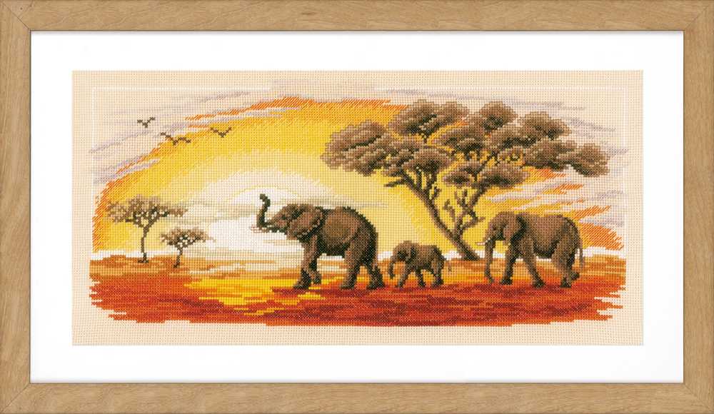 Elephants in an African Sunset. Design to be stitched with cotton pre-sorted threads onto 14 count, light brown, cotton aida fabric. Kit also includes: large-square charted design; needle; front sheet picture and instructions in eight languages. Size: 42 x 20cm or 16.8 x 8in. Stitches used: half cross stitch, cross stitch, back stitch.