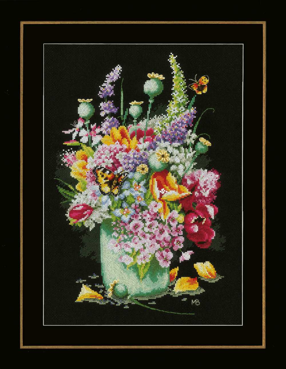 A striking image of a pot of flowers on a black background. Counted cross stitch design to be created on black, cotton, 14 count, aida fabric with cotton, pre-sorted threads. Kit also includes: needle; large-square charted design; front sheet picture and instructions in 8 languages. Approximate finished size: 27 x 39cm or 10.8 x 15.6in. Stitches used: French knot, half cross stitch, cross stitch, long stitch.