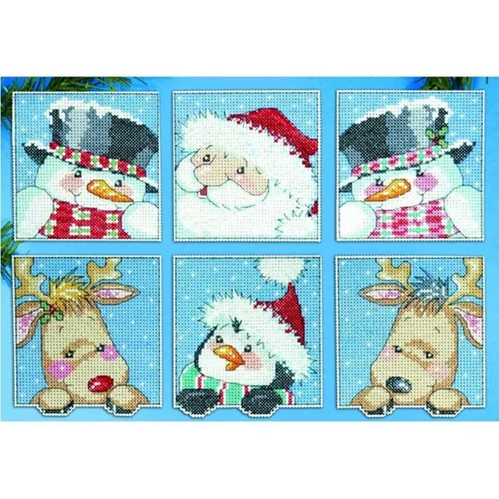 The counted cross stitch kit contains 14 count plastic canvas, stranded cottons, needle, chart and instructions. Makes six ornaments.