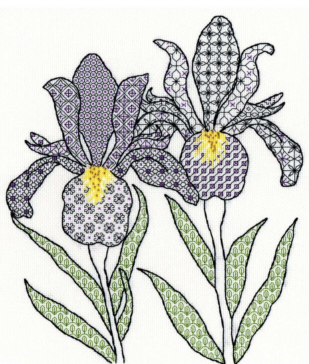 Irises Blackwork Kit - Bothy Threads Stitched on white 14 count Aida using stranded cotton, metallic thread & gold beads.