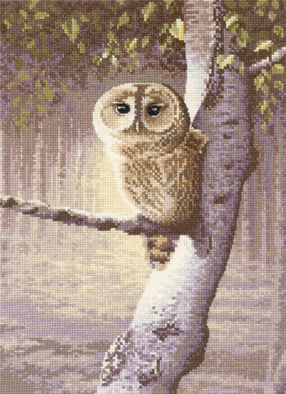 A wise old owl on his watch. Kit contains chart and instructions, needle, 27 count evenweave fabric, and presorted DMC stranded cotton threads on a loaded thread organiser. A design by Warwick Higgs. Design size approximately 20 x 28cm