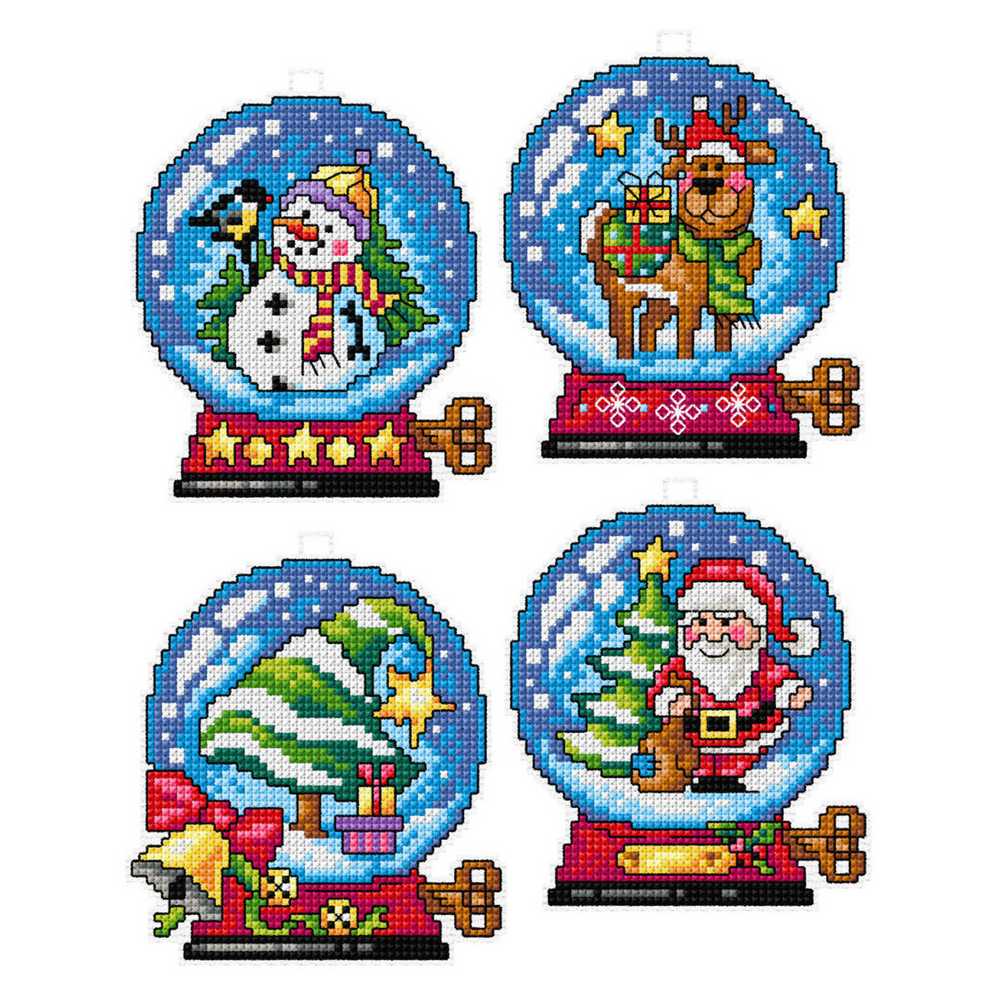 4 counted cross stitch Christmas decorations. Kit includes: 14 count plastic canvas; DMC Mouliné stranded cotton threads; needle; square charted design; front sheet picture and instructions. Approximate finished size: (w/h) 9 x 11cm or 3.5 x 4.5in.