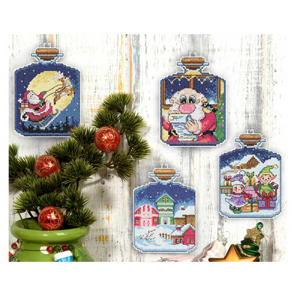Set of 4 counted cross stitch decorations. Kit includes: pre-sorted, 6-ply, mouliné, DMC, stranded cotton; 4 plastic canvas pieces; needle; chart and instructions in multiple languages (GB, NL, PL, S, F, RUS, N, FIN, DK, H, D, CZ, I). Approximate finished size of each decoration: (w/h) 8.5 x 11.5cm or 3 x 4.5in. Difficulty level: medium. Handwash only.