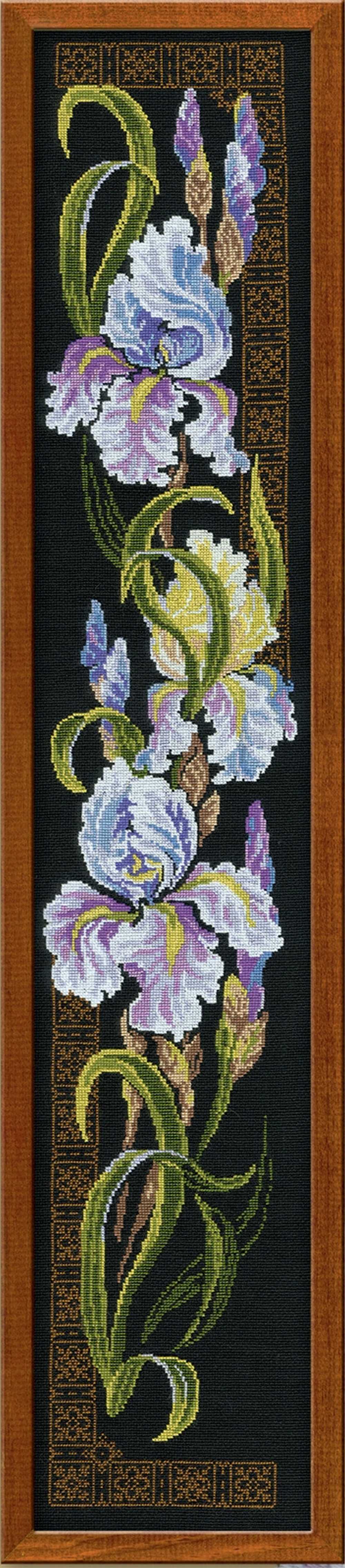 Riolis Cross Stitch Kit - Irises The kit contains Zweigart 16 count black aida fabric, wool/acrylic threads, needle, colour chart and instructions.