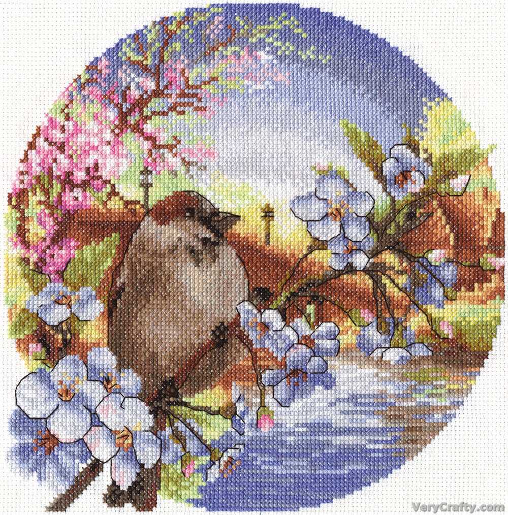 Panna - Sunrise Sparrow Counted Cross Stitch Kit - A sparrow on a blssom branch and sunrise cross stitch design.