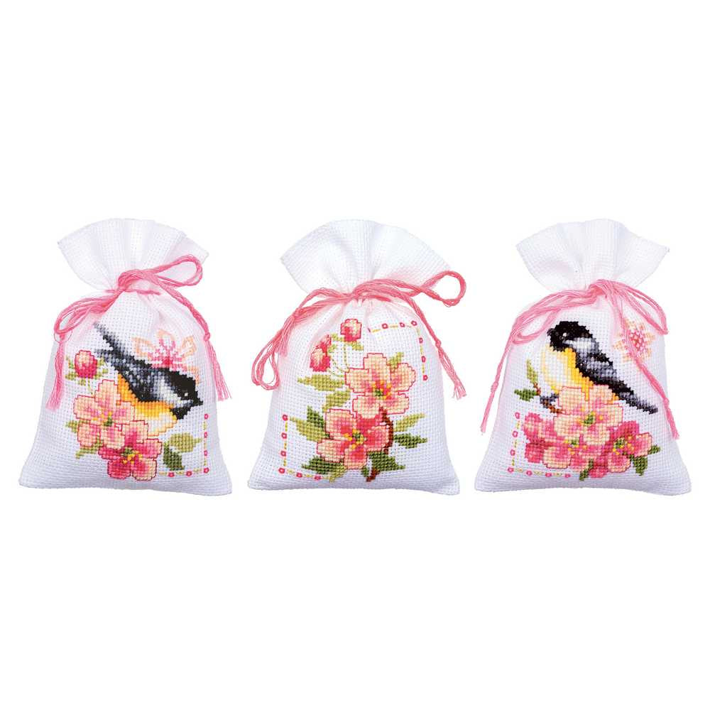Vervaco Cross Stitch Kit - Set 3 Birds and Blossoms Pot Pourri Bags