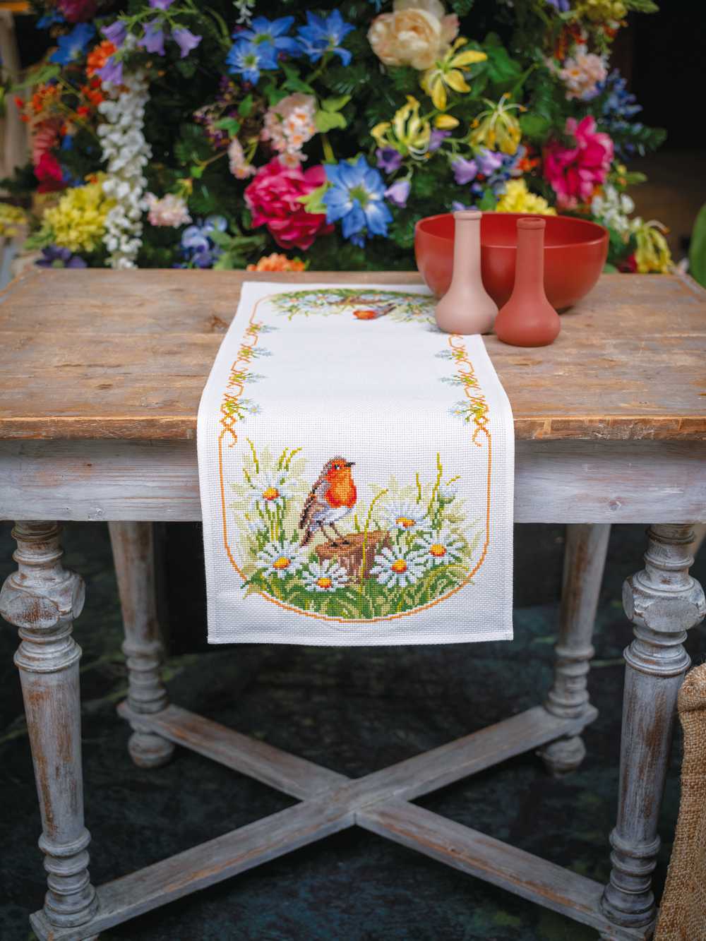 Vervaco Cross Stitch Table Runner Kit - Daisies and Robin