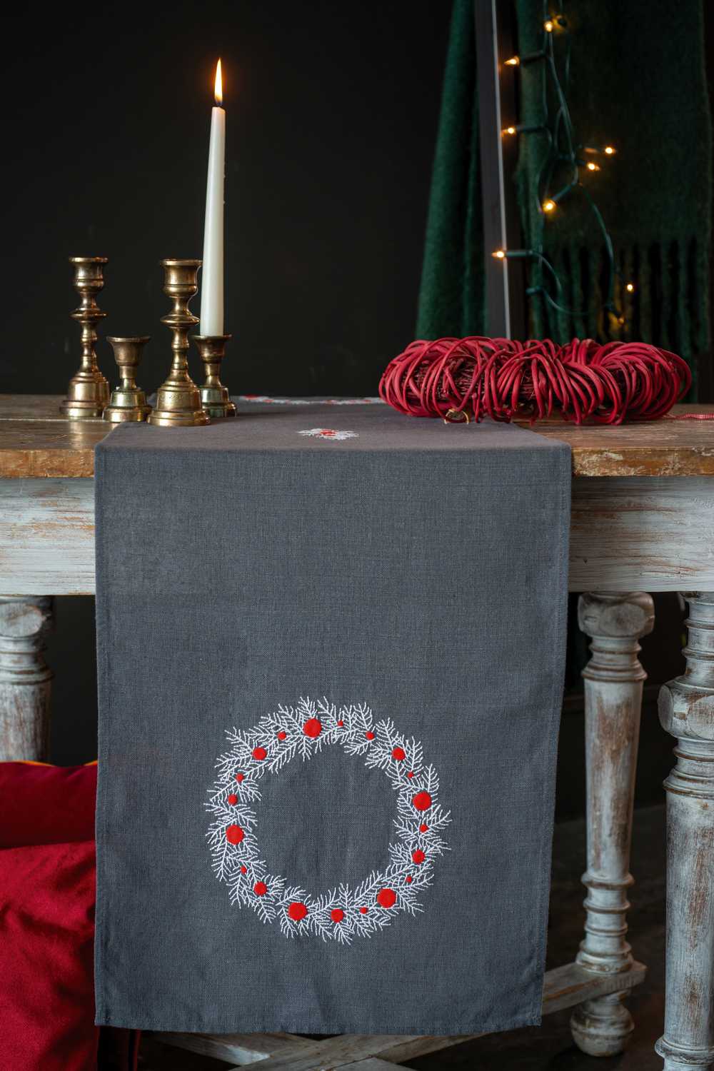 Tablecloth runner with printed design to be embroidered. Kit includes: printed, grey, 60% flax, 40% polyester, tablecloth with hemmed, inwoven border; pre-sorted, stranded, cotton threads; needle; large square charted design; front sheet picture and instructions. The printed design will wash out. Size: (w/h) 38 x 138cm or 15.2 x 55.2in. Stitches used: satin stitch, stem stitch, back stitch.