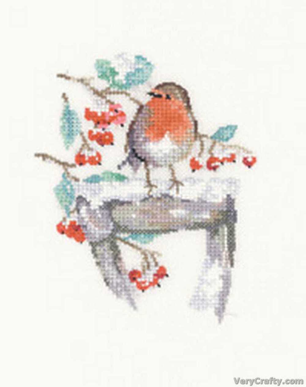 A winter Christmas robin design. Kit contains chart and instructions, needle, 14 count Aida fabric, and presorted DMC stranded cotton threads on a loaded thread organiser. A design by Sue Hill. Design size approximately 10 x 12cm