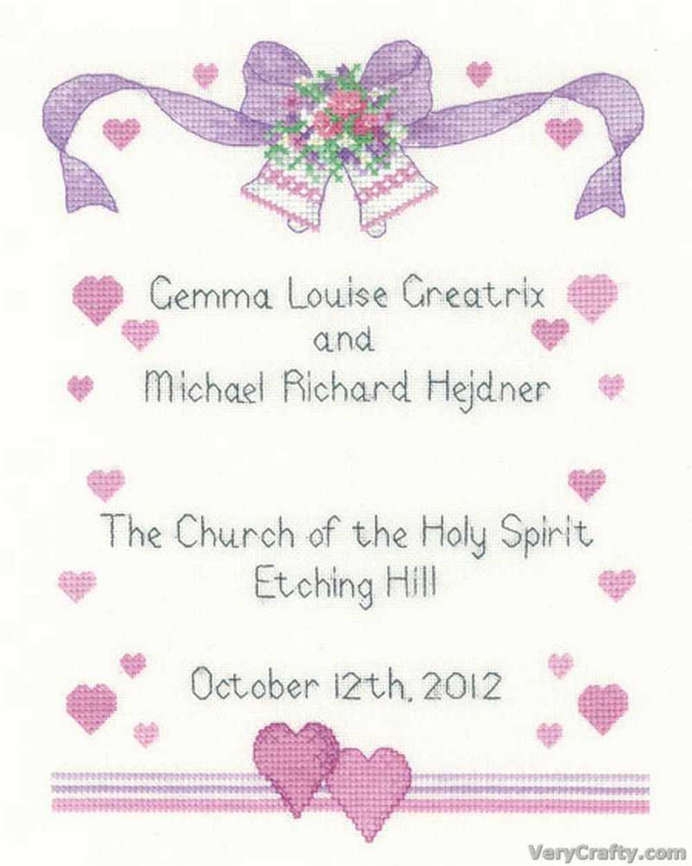 A wedding sampler with bells and bows. Kit contains chart and instructions, needle, 27 count evenweave fabric, and presorted DMC stranded cotton threads on a loaded thread organiser. A design by Sue Hill. Design size approximately 18 x 24.5cm