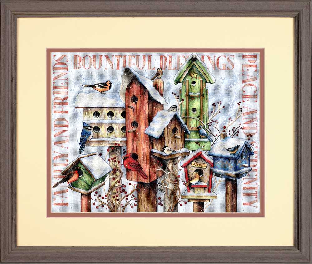 Winter Housing features a collection of beautiful birdhouses surrounded by warm sentiments. Kit contains: pre-sorted cotton thread, 14 count light blue Aida, needle and instructions. Finished Size: 14 x 11in\35 x 27 cm.